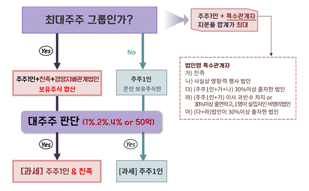 * 최대주주 그룹에 해당하는 경우 주주1인과 그의 친족 및 경영지배관계법인의 보유주식 합계로 주권상장법인의 대주주 요건을 판단합니다. [하단 참고]