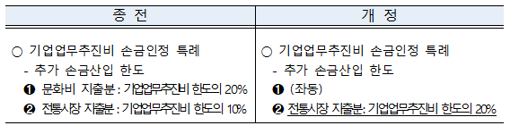 ○ 전통시장에서 법인카드로 기업업무추진비를 지출한 경우 종전에는 손금산입 한도액의 10% 범위 내에서 추가로 손금산입 가능했으나 한도 비율이 20%로 상향되었습니다.